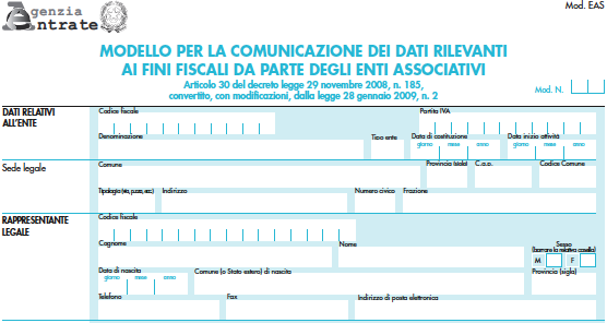 N.B. Il Codice del Terzo settore (art. 94 del DLgs 117/2017) prevede che “gli enti del Terzo settore non si applicano le disposizioni di cui all'articolo 30 del decreto-legge 29 novembre 2008 n. 185, convertito, con modificazioni dalla legge 28 gennaio 2009, n. 2 e comunque tali enti non sono tenuti alla presentazione dell'apposito modello di cui al comma 1 del medesimo articolo 30”, ossia sono esonerati dalla trasmissione del Modello EAS.